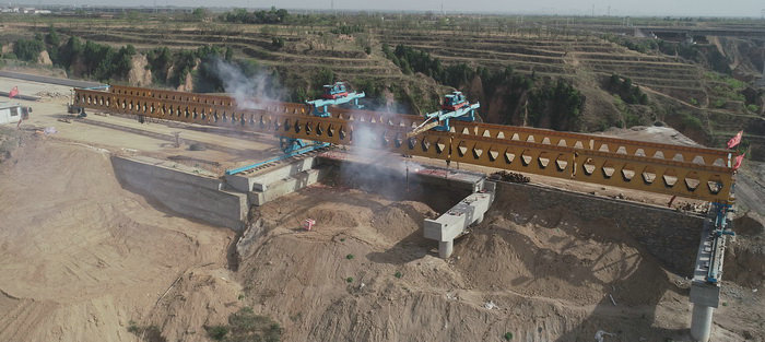 圖為大橋架設(shè)首片梁據(jù)悉,合銅高速公路建成后將極大改善銅川市東西方向的交通狀況,對促進(jìn)陜西渭北果業(yè)和煤炭資源外運(yùn)、帶動(dòng)革命老區(qū)振興和紅色旅游開發(fā)具有重要的意義。