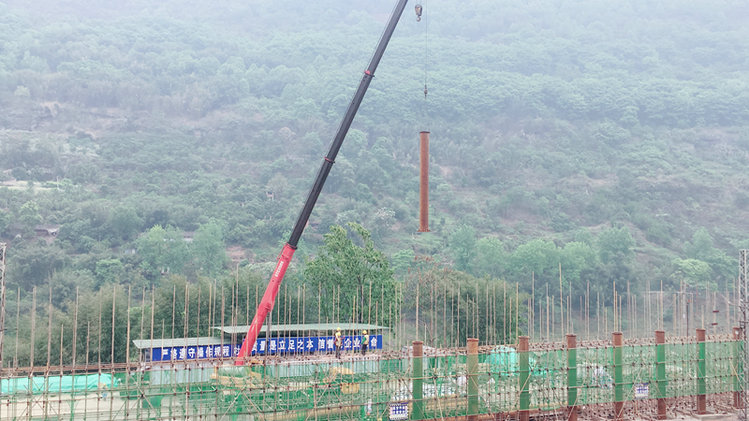 為保證項(xiàng)目施工過程中不影響內(nèi)六線鐵路正常運(yùn)營(yíng),水富港及火車站與渝昆高速(水麻段)聯(lián)絡(luò)線上跨、下穿內(nèi)六線立交工程在該鐵路上方設(shè)計(jì)了跨鐵路防護(hù)棚架,其中,在鐵路兩旁共設(shè)計(jì)了66根高度為11.4米至13.82m的鋼管立柱。本次鋼管立柱吊裝作業(yè)地點(diǎn)距離內(nèi)六線鐵路10KV回流線水平距離僅有2m,施工安全風(fēng)險(xiǎn)極大。為此,四公司水富港立交項(xiàng)目部在施工前抓住施工要點(diǎn)和安全重點(diǎn)召開專題討論會(huì),研究制定出最優(yōu)的安全施工方案,對(duì)現(xiàn)場(chǎng)作業(yè)人員進(jìn)行了系統(tǒng)的專項(xiàng)安全培訓(xùn),并積極與鐵路管理部門協(xié)商溝通,申請(qǐng)位于施工范圍內(nèi)的內(nèi)六線鐵路區(qū)段暫停運(yùn)營(yíng)4小時(shí),為防護(hù)棚架鋼管立柱吊裝作業(yè)提供充足的施工時(shí)間。在吊裝過程中,該項(xiàng)目部調(diào)配一輛50t吊車依次將16根直徑為0.63米,高約7米的鋼管立柱垂直吊裝超過10m高的支架平臺(tái)后,精準(zhǔn)穿過1.5m×1.5m的支架吊裝孔,與預(yù)埋的法蘭盤進(jìn)行螺栓連接。