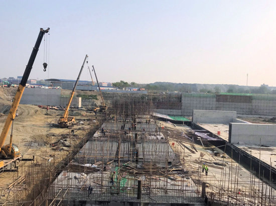 施工現(xiàn)場 據(jù)悉,該閘基設置8孔泄水閘孔,結(jié)構(gòu)釆用開敞式平底堰,閘室順水流方向長17m,寬15 m,底板采用C25鋼筋砼,厚度2.5m,整個閘基澆筑混凝土6164方。德陽項目部自勞動競賽活動以來,嚴抓防疫、施工兩條線不放松,建立專項施工方案,配足配強人、機、物,精心組織,積極動員參建員工工作士氣,多舉措確?,F(xiàn)場施工安全高效,為安全度汛奠定了基礎。