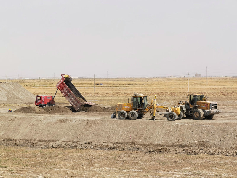裝載機(jī)、壓路機(jī)、自卸車,等等,近二百輛施工車輛在且末站場(chǎng)往來穿梭,好不熱鬧。