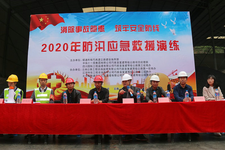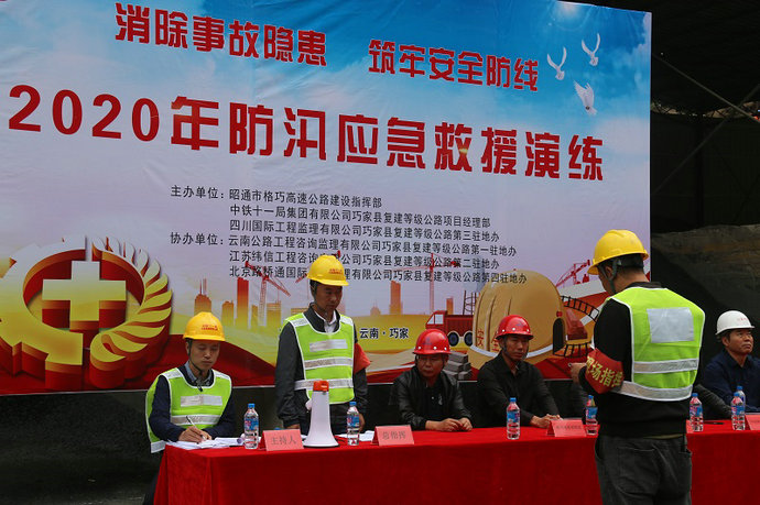 按照“安全第一,預防為主,綜合治理”的安全管理方針,為切實加強中鐵十一局集團第二工程有限公司巧家復建等級公路項目部全體參建人員的防汛抗災意識,有效提高減災救災能力,確保項目管轄范圍內(nèi)遭遇暴雨時安全度汛,快速高效的實施救援工作,最大限度的將損失減小到最低程度,維護參建人員的安全,進一步普及防汛安全知識,項目部在中鐵十一局集團第二工程有限公司混凝土拌合站管理中心巧家復建等級公路3號拌合站組織開展了一次科學嚴謹?shù)姆篮槎妊磻毖菥殹?br /> 本次應急演練特邀巧家縣應急管理局副局長嚴飛、格巧高速公路建設指揮部副指揮長何明瑞、格巧高速公路建設指揮部安全處處長林仁才、四川國際工程監(jiān)理有限公司巧家復建等級公路駐地辦莫光耀、云南公路工程咨詢監(jiān)理有限公司巧家縣復建等級公路駐地辦陸啟君、江蘇緯信工程咨詢有限公司巧家縣復建等級公路駐地辦孫悅忠等領導蒞臨指導演練。