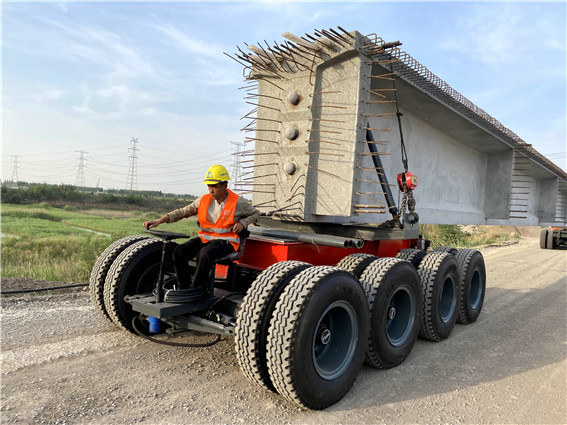 據(jù)悉,此次架設(shè)為京德高速文安洼1號(hào)特大橋162號(hào)墩左幅T梁,T梁長(zhǎng)30米,寬1.5米,高2米,重達(dá)80噸。