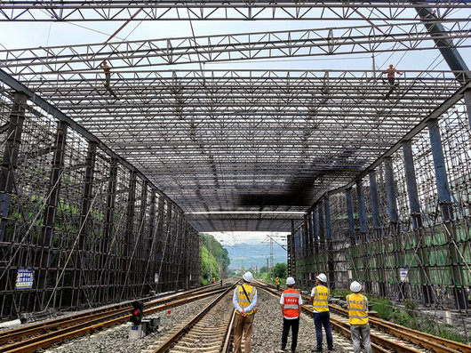 本次建設的跨鐵防護棚架位于內六線K142+668-K142+796區(qū)域,橫跨內六線5股鐵路營運線,長度為110m,最大跨度為35.25m,鋼管立柱最大高度為13.82m,鋼桁梁截面尺寸為1.1m×0.9m,橫向間距0.6m,總計吊裝86片鋼桁梁。面對鋼桁梁吊裝作業(yè)跨度大、施工精準度高,吊裝數(shù)量多,施工時間緊等諸多問題,中鐵七局四公司水富港項目部主動出擊,在吊裝作業(yè)前,精心組織施工工序流程,明確施工要點負責人職責,確定采用起重量分別為100t和130t的兩臺吊車在兩端同時吊裝的施工方案,對鋼桁梁吊裝作業(yè)人員進行安全教育培訓,強化施工安全意識。同時,該項目部負責人積極與成都鐵路局施工辦、宜賓工電段取得聯(lián)系,主動申報Ⅱ級要點施工計劃,申請鋼桁梁吊裝作業(yè)期間暫停途經列車運營,確保施工作業(yè)全過程安全。經過8小時奮力鏖戰(zhàn),中鐵七局四公司水富港項目部高效優(yōu)質地完成了本次跨鐵防護棚架鋼桁梁吊裝作業(yè),為下一步鐵路營運線上方掛籃施工打下堅實基礎。