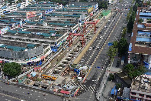金府站為成都地鐵6號(hào)線一、二期工程中間車站,與遠(yuǎn)期規(guī)劃的地鐵27號(hào)線節(jié)點(diǎn)換乘,車站位于交大路與金府路交叉路口東南側(cè),小里端橫跨金府路口,沿交大路出城方向輔道呈南北向布置。車站兩端頭均為盾構(gòu)接收井。共設(shè)4個(gè)出入口和兩組風(fēng)亭,主體基坑長(zhǎng)311.3m,標(biāo)準(zhǔn)段寬20.4m,北端側(cè)擴(kuò)大端寬24.4m,南側(cè)擴(kuò)大端寬24.85m,基坑挖深20.6m至22.65m。主體結(jié)構(gòu)標(biāo)準(zhǔn)段為地下兩層雙跨結(jié)構(gòu),局部為拱形頂板單跨結(jié)構(gòu)(136m)。車站采用敞口、全蓋、半蓋結(jié)合設(shè)計(jì),半蓋挖法施工,其中跨金府路路口為全蓋施工?;訃o(hù)結(jié)構(gòu)采用鉆孔灌注樁+混凝土支撐+鋼支撐支撐體系,主體結(jié)構(gòu)為現(xiàn)澆鋼筋混凝土結(jié)構(gòu)。