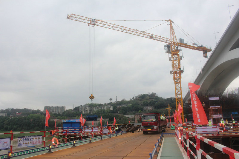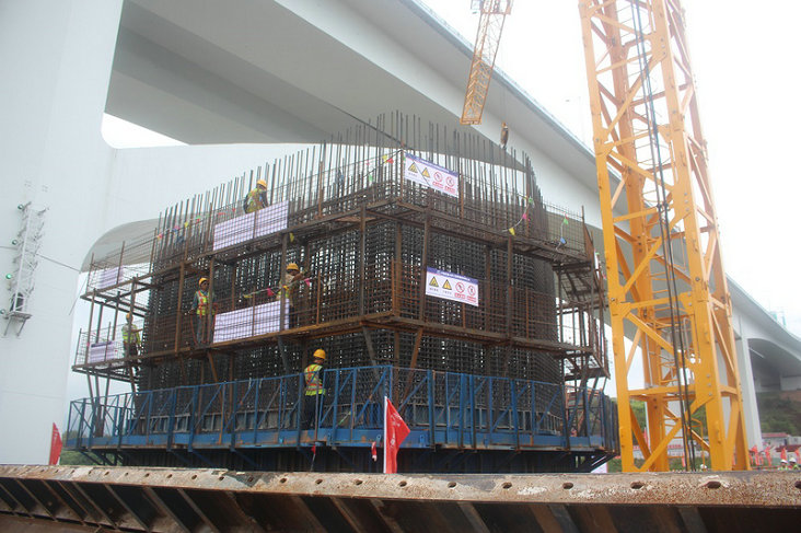 17標(biāo)工人在廖家溪軌道專用橋吊裝墩柱模板