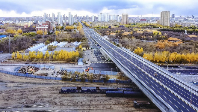 齊齊哈爾民航路跨線橋工程是該市“雙向雙軸、一環(huán)九射”主干路網(wǎng)布局的重要組成部分??偼顿Y5.74億元,全長2.793公里,主路雙向六車道,設(shè)計時速60公里。其中主橋長352米、寬34.4米,跨越哈齊高鐵等 21 股鐵路,雙側(cè)轉(zhuǎn)體總重量55000噸,創(chuàng)造了嚴寒地區(qū)同類結(jié)構(gòu)橋梁跨度最大、噸位最重的兩項中國之最。