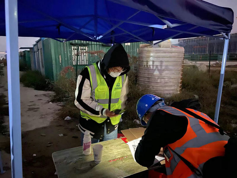 項(xiàng)目組織青年員工在核酸檢測(cè)現(xiàn)場(chǎng)維持秩序,組織項(xiàng)目施工人員有序排隊(duì),幫助使用老年機(jī)的人員進(jìn)行身份證登記,提醒人員打開安康碼,幫助核酸檢測(cè)人員進(jìn)行掃碼。為全面把住入口關(guān),項(xiàng)目安排了員工進(jìn)行24小時(shí)值班,對(duì)工地、項(xiàng)目部、生活區(qū)進(jìn)入人員查看兩碼、登記信息,確保項(xiàng)目的施工、人員安全。