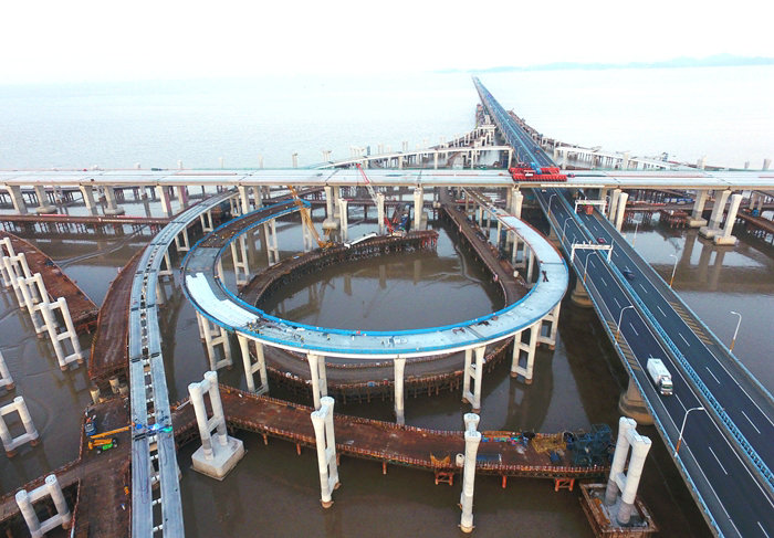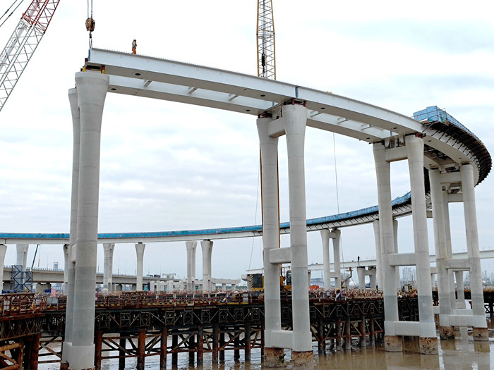 杭甬復(fù)線濱海高架橋最后一座“堡壘”,也是全線海上唯一一座連續(xù)梁,于2021年12月25日成功合攏之后,該項目濱?;ネㄖ骶€橋、拼寬橋、匝道橋成為2022年施工的主戰(zhàn)場,他們在兩次超強臺風(fēng)導(dǎo)致工期緊和新冠疫情防控形勢嚴峻的壓力下,截止12月上旬,一個個節(jié)點相繼突破,圓滿完成均長98米的1027根樁基和主線橋、拼寬橋、8座匝道橋170座承臺,完成7座匝道橋318座墩柱,建成1座卸梁站、2座提梁站,架設(shè)20米—30米的鋼箱梁124片,目前主要工程量是承臺、墩柱收尾和制梁、運梁、架梁及橋面板施工。