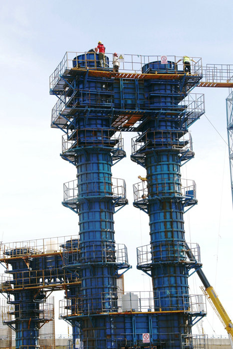 在匝道橋墩身施工中,該項目部采取從匝道的核心向外輻射,從一兩個點到大面積開花,從東到西,從南到北,集中人力、設備、管理、技術等優(yōu)勢資源,展開一場“你追我趕爭第一、杭甬復線展風采”如火如荼的勞動競賽熱潮,每個施工隊都在上緊的“鏈條”上,不敢松懈,施工進度不斷加快,一座座橋墩魔術般聳立在海面上,G匝道率先完成澆注任務,其余匝道橋墩先后順利封頂,捷報頻傳。