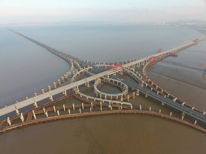 杭甬復線濱海互通設計呈苜蓿葉狀,設主線橋、拼寬橋、8座匝道橋,全長9705米,位于寧波市鎮(zhèn)海區(qū)淺海水域,設1027根樁基、169座承臺、636座墩身,采用花瓶墩和圓柱式墩造型。該互通3次上跨、4次交匯金塘大橋,建成后,是東海海域寧波境內(nèi)一道雄偉壯觀的人文景觀,將成為寧波市的標志性建筑。