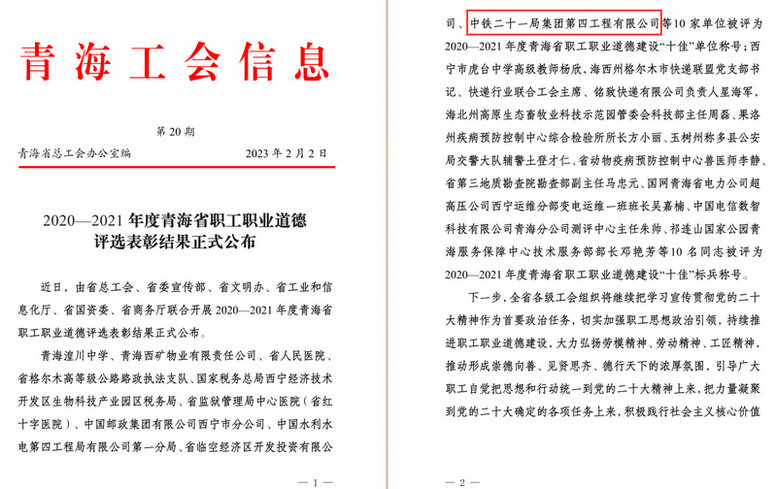 近日,由青海省總工會(huì)、省委宣傳部、省文明辦、省工業(yè)和信息化廳、省國(guó)資委、省商務(wù)廳聯(lián)合開(kāi)展的 2020—2021 年度青海省職工職業(yè)道德評(píng)選表彰結(jié)果正式公布,中鐵二十一局四公司被評(píng)為2020—2021 年度青海省職工職業(yè)道德建設(shè)“十佳”單位稱號(hào)。