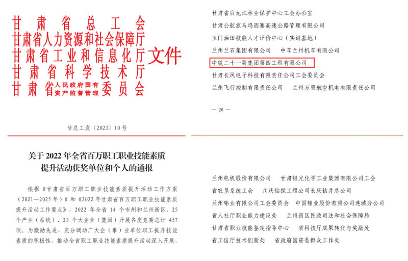 近日,從甘肅省總工會獲悉,中鐵二十一局四公司在甘肅省2022年百萬職工職業(yè)技能素質(zhì)提升活動中被評為優(yōu)秀組織單位。