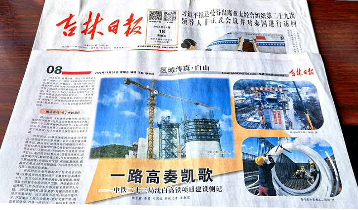 “初冬時(shí)節(jié),捷報(bào)頻傳。灣溝北站站場(chǎng)破土動(dòng)工,中鐵二十三局沈白高鐵建設(shè)項(xiàng)目全線啟動(dòng);碧水奔流,聲震峽谷。灣溝特大橋、跨201國(guó)道大橋、湯河1#2#3#大橋等橋墩巍然挺立,經(jīng)受住了滔滔洪水的嚴(yán)峻考驗(yàn);施工現(xiàn)場(chǎng),機(jī)聲隆隆。掌子面上工人們手持鑿巖機(jī)緊張作業(yè),不斷改寫掘進(jìn)日進(jìn)尺的最新紀(jì)錄……一條條隧道、一座座橋梁、一段段路基,穿越大山、跨過(guò)江河、橫跨村屯,講述著沈白高鐵項(xiàng)目建設(shè)的動(dòng)人故事,展現(xiàn)著中鐵二十三局全體建設(shè)者的時(shí)代風(fēng)采。”這是長(zhǎng)篇通訊《一路高奏凱歌》的“開場(chǎng)白”。