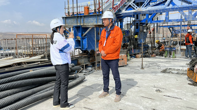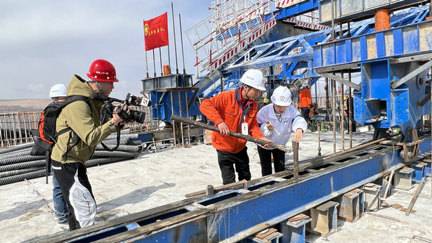記者首先采訪了項目經理,詢問并了解了任灣茹河特大橋的施工進度情況、施工難點以及選線意義。隨后,記者在項目經理的陪同下來到特大橋的11#墩頂,項目經理向記者詳細地介紹了更多有關任灣茹河特大橋的管理、日常作業(yè)、施工安全等信息,通過直播讓更多人了解到銀昆LJ12-2標的重點工程建設情況。在到達墩頂后,記者采訪了技術員張治飛,了解了技術員的日常工作和目前正在攻堅的掛籃施工難點等情況。張治飛為記者介紹并演示了項目部組織研發(fā)的一種新套組,針對現(xiàn)場問題,這種新套組能夠極大地節(jié)本增效,而且申請了專利,之后能在更多標段推廣運用。張治飛自豪地表示,自己身為彭陽本地人,非常期待銀昆高速的建成通車,可以將自己家鄉(xiāng)的美食特產帶到更多的地方,讓更多人了解彭陽、禮贊彭陽。