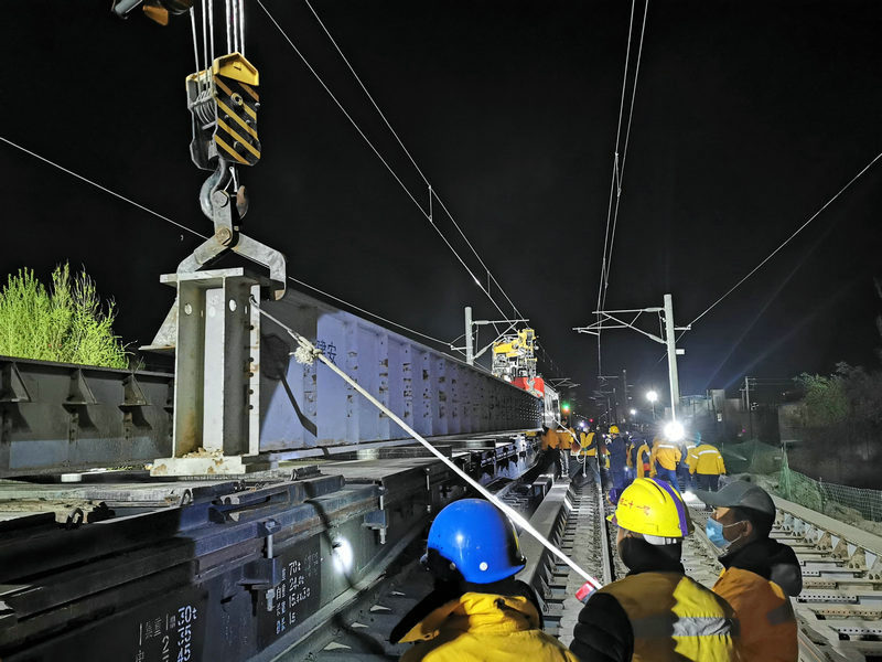 4月3日凌晨,夜幕下大風伴著雨夾雪,由中鐵二十一局一公司哈密分公司承建的既有哈密聯(lián)絡線雙線電氣化鐵路新建鋼筋混凝土箱形橋下穿鐵路項目施工現(xiàn)場機械轟鳴,燈火通明,第12片鋼便梁安全平穩(wěn)地落在沉井上,經80多名員工連續(xù)6天18個小時天窗點的晝夜奮戰(zhàn),順利完成了既有線新建單孔箱形橋連續(xù)架設6組16米D型鋼便梁重要節(jié)點的全部施工,標志著哈密市哈密河生態(tài)恢復工程的重點建設項目取得階段性勝利。