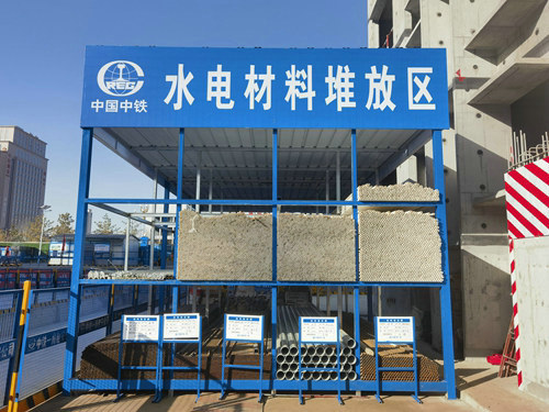 嚴(yán)格落實(shí)現(xiàn)場(chǎng)安全文明施工管理。項(xiàng)目部在進(jìn)入工地的入口處放置“八牌一圖”,在施工現(xiàn)場(chǎng)危險(xiǎn)部位設(shè)置明顯的安全警示標(biāo)志以及安全標(biāo)語等,并在物料堆放及施工通道等區(qū)域均采用噴有企業(yè)logo的制式圍擋進(jìn)行分隔。根據(jù)施工現(xiàn)場(chǎng)平面布置圖分區(qū)域架空放置建筑材料、現(xiàn)場(chǎng)制品、半成品、成品等,對(duì)堆放的材料掛上標(biāo)牌,注明名稱、品種、規(guī)格等信息,設(shè)立現(xiàn)場(chǎng)巡視人員,確保材料、設(shè)備的安全。