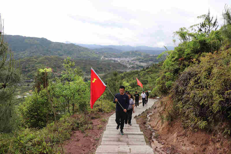 “五星紅旗迎風(fēng)飄揚(yáng),勝利歌聲多么響亮,歌唱我們親愛的祖國,從今走向繁榮富強(qiáng).....”伴隨著大家的歌聲,隊伍來到了牛頂尖山腳下。