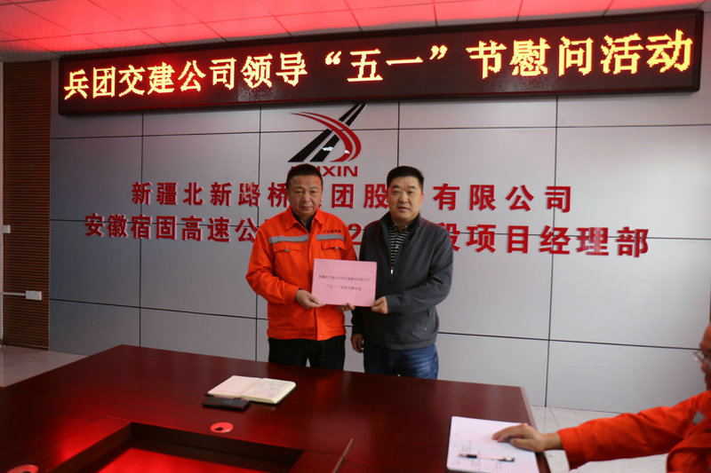 宿州訊(通訊員 劉繼紅)五一奮戰(zhàn)不打烊,公司慰問暖人心。近日,兵團(tuán)交建公司黨委副書記、副總經(jīng)理趙光軍帶著對(duì)項(xiàng)目職工的深切關(guān)懷,深入安徽宿固高速公路TJ02合同段項(xiàng)目經(jīng)理部施工一線看望慰問“五一”節(jié)期間仍然奮戰(zhàn)在一線的干部職工,為大家送來兵團(tuán)交建公司的問候與美好祝愿。