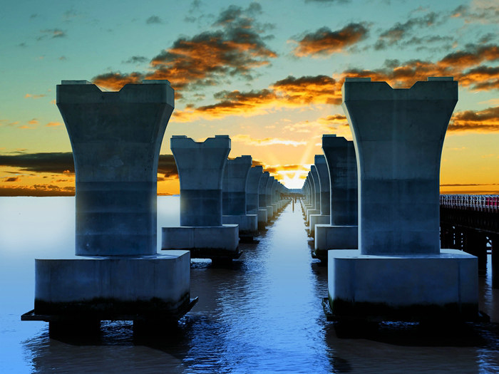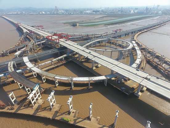 架梁隊(duì)的員工對(duì)流水作業(yè)般的工序流程非常熟悉,當(dāng)從舟山運(yùn)梁的貨船駛進(jìn)“港池”,便有人麻利地操縱龍門(mén)吊,在人工配合下,將一片片重達(dá)170噸的鋼混疊合梁吊起來(lái),沿著軌道向后緩緩滑行到20多米處的存梁區(qū),由運(yùn)梁車(chē)安全地轉(zhuǎn)運(yùn)到指定位置,兩臺(tái)各150噸的履帶吊合力將疊合梁舉起來(lái),慢慢提升到20多米的高度,然后降落,平穩(wěn)地落在橋墩上。當(dāng)?shù)诙喊卜诺轿缓?,立刻用螺桿和螺帽將兩片梁進(jìn)行固定,然后由電焊工對(duì)兩片梁進(jìn)行收尾焊接。夜間匝道橋焊接橋梁的焊花,猶如無(wú)數(shù)根金絲線從高處潑灑下來(lái),點(diǎn)亮了夜空,是暗夜里一道奪目的風(fēng)景,吸引著夜間現(xiàn)場(chǎng)值班人員的目光。