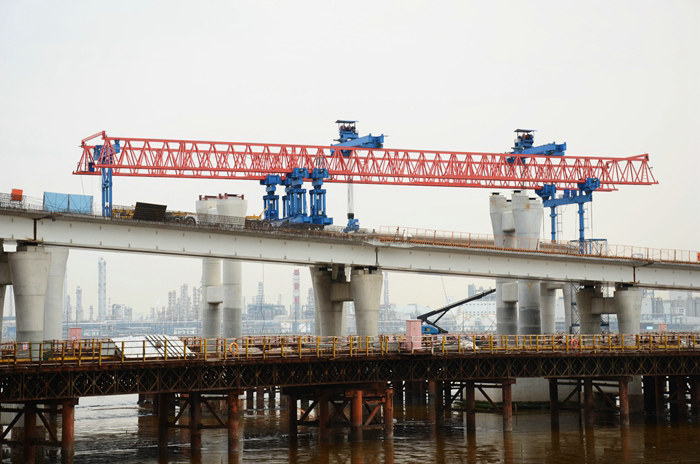 H匝道設(shè)16座橋墩,3聯(lián)9跨18片梁,全長(zhǎng) 261米,一端與金塘大橋相接,另一頭與濱?;ネㄖ骶€會(huì)合,中段與F匝道互通。采取架橋機(jī)、履帶吊在G、E、F3座匝道同步架設(shè)的辦法贏得先機(jī),現(xiàn)場(chǎng)施工人員熟練地掌握了的操作方法,將積累的經(jīng)驗(yàn)復(fù)制到H匝道架梁全過(guò)程。為保證架梁安全,防止發(fā)生人員高空墜海事故,他們認(rèn)真抓好工前、工中、工后“三工教育”,讓施工人員樹(shù)立高度的安全意識(shí),杜絕僥幸和盲干心理,從思想上筑起堅(jiān)固的安全屏障。與此同時(shí),每天早、中、晚,安排專(zhuān)人對(duì)運(yùn)梁車(chē)及架橋機(jī)的滑輪、鋼絲繩、吊鉤等各部位進(jìn)行一次全面、徹底地隱患排查,發(fā)現(xiàn)不安全苗頭立即采取措施,絕不允許機(jī)械設(shè)備“帶病”作業(yè),為架梁打造平安環(huán)境。同時(shí)開(kāi)展“六比六創(chuàng).鐵建先鋒杯”勞動(dòng)競(jìng)賽活動(dòng),在全員中掀起比學(xué)趕幫超的大干熱潮,為施工穩(wěn)步推進(jìn)助威助力。