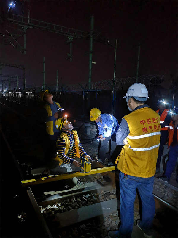 月黑風(fēng)高夜,施工正忙時(shí),2018年10月19日晚,中鐵武漢電氣化局廣州分公司梅汕電氣化項(xiàng)目部在潮汕高鐵站東岔區(qū)進(jìn)行013#至073#下行AF線架設(shè)(施工里程:杭深線K1316+031.7至K1317+325),也是潮汕高鐵站東岔區(qū)改造影響較大的最后一根附加線架設(shè),此AF線架設(shè)的完成預(yù)示著潮汕站改施工將進(jìn)入白熱化階段,隨著下一步既有附加線的拆除施工面將全面展開,為10月30日工程竣工奠定了基礎(chǔ)。
