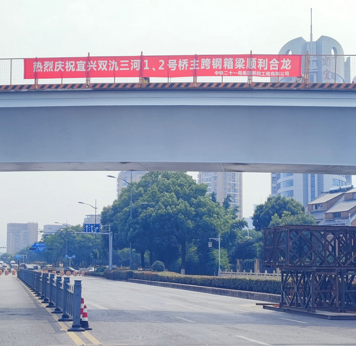 6月11日,中鐵二十一局四公司宜興雙氿三河一期1號橋主跨上跨氿濱大道鋼箱梁順利合龍,標志著該橋重點控制性工程圓滿收官。