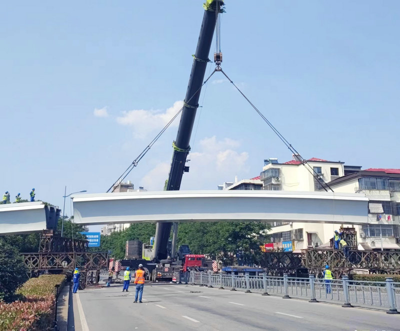 本次封閉施工先后進行了封閉道路、安裝臨時支墩、吊裝鋼箱梁、焊接焊縫、安裝護欄、臨時支墩防護、開通道路等多道施工工序。在項目部所有參建員工的共同努力下,按時圓滿完成了所有施工任務。