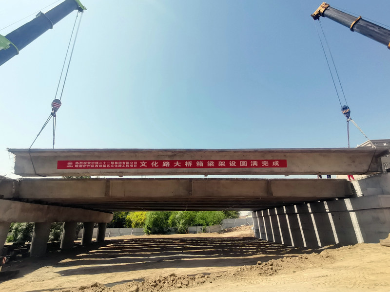 文化路大橋跨越西河壩,橫穿哈密河國家濕地公園,是集景觀性、功能性、環(huán)保性于一體的橋梁,既能滿足居民的出行需求,也能最大程度節(jié)約用地,更好地保護(hù)哈密河生態(tài)環(huán)境。此次大橋箱梁順利架設(shè)完成,打通了文化路全線最重要的施工斷點,為后續(xù)水穩(wěn)基層及瀝青面層施工爭取了有效工期,下一步將全力以赴推進(jìn)施工建設(shè),確保今年9月按期開通。