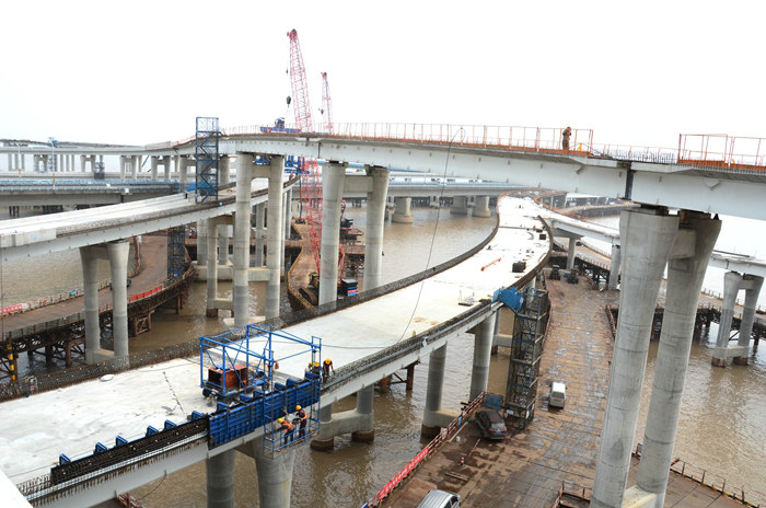 濱海互通全長(zhǎng)9705米,由1座主線(xiàn)、4座拼寬和8座匝道橋組成,呈苜蓿葉狀,設(shè)計(jì)470片鋼混疊合梁,3條匝道上跨甬舟高速金塘大橋,4條匝道與金堂大橋東西兩側(cè)相交,是亞洲最大的海上互通。其中B匝道全長(zhǎng)786.068米,鋼混疊合梁60片、30米長(zhǎng),梁面寬,且為曲線(xiàn),最大縱坡3.7%、橫坡3%,架橋機(jī)過(guò)孔時(shí),支腿調(diào)整難度大,運(yùn)梁車(chē)橫坡調(diào)整功能和轉(zhuǎn)向功能必須正常,由于是偏載運(yùn)梁,曲線(xiàn)喂梁,運(yùn)梁過(guò)程中必須處于平穩(wěn)狀態(tài),避免傾覆。海上高空架梁安全風(fēng)險(xiǎn)高,不易察覺(jué)的隱患多。針對(duì)這一現(xiàn)象,他們從卸梁站、提梁站再到履帶吊起吊、運(yùn)梁車(chē)運(yùn)梁、喂梁、架設(shè)、安放等每個(gè)環(huán)節(jié),保持高度的安全警惕性,4名副經(jīng)理,以及安全總監(jiān)、安全部長(zhǎng)等現(xiàn)場(chǎng)管理人員,不放過(guò)任何蛛絲馬跡,上午和下午架梁前都要仔細(xì)排查一遍,是否存在不安全苗頭,鋼絲繩、滑輪、吊鉤有無(wú)破損、老化、卡簧失靈等細(xì)微變化,機(jī)械設(shè)備完全達(dá)到最佳狀態(tài),才準(zhǔn)許作業(yè)。公司副總經(jīng)理兼杭甬項(xiàng)目黨支部書(shū)記、項(xiàng)目負(fù)責(zé)人黃偉,三天兩頭深入濱?;ネ芰含F(xiàn)場(chǎng)指導(dǎo)施工,就地解決難題,保證卸梁、提梁、運(yùn)梁、架梁等每一道工序不出任何紕漏。