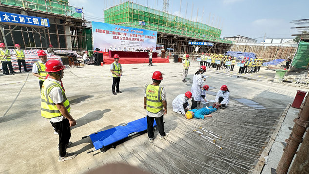 高墜演練現(xiàn)場設(shè)在和諧家園二期10#樓北側(cè),模擬一名架子工在車庫頂板搭設(shè)臨邊防護(hù)時,因未按要求正確使用安全帶不慎墜落,發(fā)生高墜事故。演練從發(fā)現(xiàn)傷員、通知現(xiàn)場安全人員、向項目部匯報、啟動項目緊急救援預(yù)案、現(xiàn)場聯(lián)絡(luò)組、搶險組、保衛(wèi)組、救護(hù)組、后勤組緊急集合,按照項目部應(yīng)急預(yù)案迅速開展救援全部環(huán)節(jié)。演練過程場景逼真、人員緊密配合、各盡其責(zé)、救援有序,充分展示了事故處理過程中的緊急搶救能力,進(jìn)一步提高了參建人員的防范意識和處理突發(fā)事件的能力,保障項目安全有序推進(jìn)。