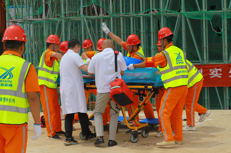 隨著演練總指揮一聲指令,演練正式開(kāi)始,所有參練人員著裝整齊,按照應(yīng)急預(yù)案分工組織實(shí)施。此次演練模擬因天氣較熱,施工人員在爬梯塔過(guò)程中腳下踩空,不慎從5米多高的臨邊防護(hù)處跌落摔傷,頭部出血,陷入昏迷狀態(tài)。事故發(fā)生后同班作業(yè)人員立即報(bào)告安全員,安全員立即撥打救援電話(huà),迅速向上級(jí)簡(jiǎn)要報(bào)告事故情況(事故發(fā)生地點(diǎn)、人員傷亡情況等),立即啟動(dòng)應(yīng)急救援預(yù)案,并對(duì)受傷人員采取臨時(shí)救助。救援小組快速判斷事故狀況并拉起警戒線(xiàn),進(jìn)行救援。隨著救護(hù)車(chē)到達(dá)事故現(xiàn)場(chǎng),傷員被安全送往醫(yī)院,險(xiǎn)情告一段落。事故調(diào)查組隨即對(duì)事故展開(kāi)調(diào)查,總結(jié)原因教訓(xùn)。