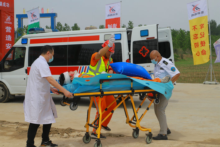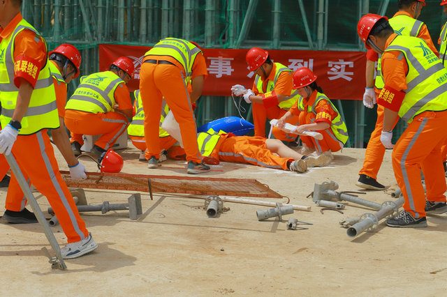 本次演練模擬新汴河特大橋施工現(xiàn)場(chǎng)安全爬梯安裝施工時(shí),施工作業(yè)人員因未掛安全帶,失足從爬梯上墜落,導(dǎo)致發(fā)生高處墜落事故,作業(yè)人員頭部及腿部受傷嚴(yán)重。接到事故通知后,項(xiàng)目部立即啟動(dòng)應(yīng)急救援預(yù)案,保衛(wèi)警戒組、應(yīng)急救援組、通信聯(lián)絡(luò)組、醫(yī)療救護(hù)組、后勤保障組、善后處理組等攜帶救援設(shè)備迅速趕赴現(xiàn)場(chǎng)實(shí)施救援,同時(shí)協(xié)調(diào)醫(yī)院等外部救援力量,讓傷者迅速得到進(jìn)一步治療。演練過程中,各應(yīng)急救援小組反應(yīng)迅速、分工明確、緊密配合,第一時(shí)間開展救援并成功處置險(xiǎn)情。