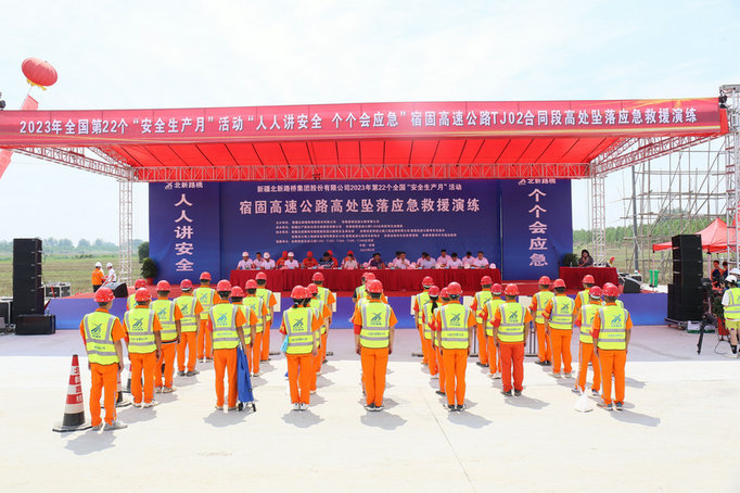 宿州訊(通訊員 劉繼紅)6月21日,兵團(tuán)交建公司安徽宿固高速TJ02合同段項(xiàng)目組織開展高空墜落應(yīng)急救援演練活動(dòng)。宿州市交通局陳鳳軍局長(zhǎng)、宿州交通執(zhí)法大隊(duì)郁副梅支隊(duì)長(zhǎng)、埇橋區(qū)應(yīng)急局胡少山主任、宿州市皖北醫(yī)院急救中心安小峰主任、宿固高速公司領(lǐng)導(dǎo)及宿固高速項(xiàng)目各參建單位代表等100余人參加活動(dòng)。