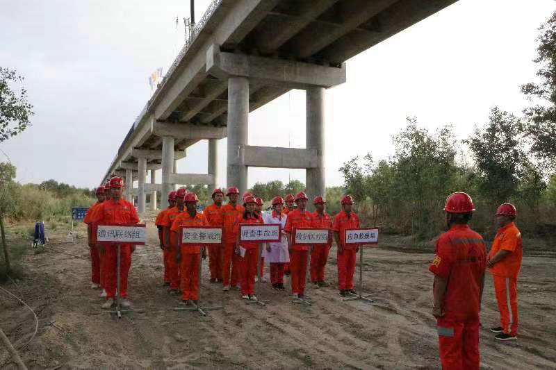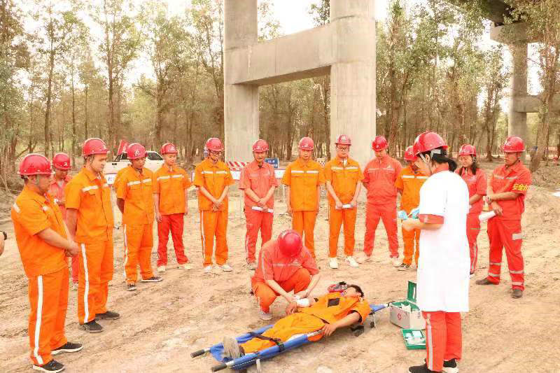 本次演練模擬背景于一名工人在葉爾羌河特大橋14#墩作業(yè)平臺(tái)鋼筋綁扎施工過(guò)程中,由于未系好安全帶不慎從高處墜落至地面,被現(xiàn)場(chǎng)技術(shù)員及時(shí)發(fā)現(xiàn),立即向總指揮報(bào)告事故突發(fā)情況,總指揮接到報(bào)告后立即啟動(dòng)高處墜落安全事故應(yīng)急救援預(yù)案,通知現(xiàn)場(chǎng)搶險(xiǎn)救援組、醫(yī)療救護(hù)組、警戒疏散組、通訊聯(lián)絡(luò)組、事故調(diào)查組、后勤保障組等小組立即趕赴事故現(xiàn)場(chǎng),按照應(yīng)急預(yù)案迅速開(kāi)展救援全部環(huán)節(jié)。