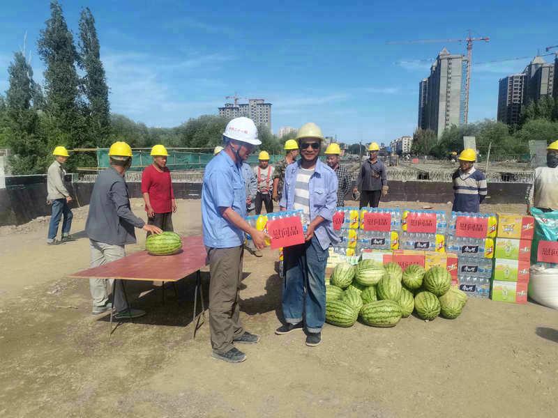 7月10日,項目部工委先后對工人宿舍降溫設(shè)備、食堂衛(wèi)生、食品安全等情況進(jìn)行了詳細(xì)檢查,隨后為67名在烈日下緊張施工的工人們送上了包含飲料、礦泉水、西瓜、綠豆、防暑藥品等物資的“清涼”大禮包,對工人們表示敬意和感謝,并要求施工現(xiàn)場負(fù)責(zé)人一定要高度重視高溫下勞作人員的安全防護(hù)和防暑降溫,切實做好飲食衛(wèi)生工作,延長午休時間,避開高溫時段工作,切實保障一線工人的身體健康。
