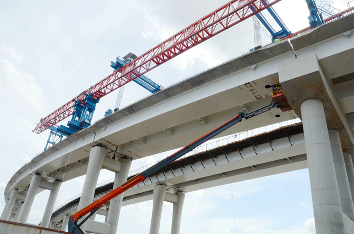 濱?;ネㄉ喜拷Y(jié)構(gòu)架梁的順利完工,解除了4級安全風(fēng)險,為橋面鋪裝鋼筋網(wǎng)、綁扎防撞欄、澆筑、8月底畫上圓滿句號掃除了障礙。