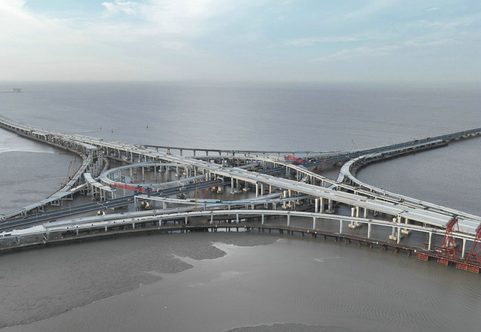 在架梁施工中,推出4臺履帶吊與兩臺架橋機配合架梁的重磅舉措,架梁速度不斷加快,安全也有了保證。從2023年3月起濱?;ネ℅、E、C、B、F、D、F等7座匝道相繼架通,其中3條匝道成功上跨金塘大橋,濱?;ネㄆ磳挊蚺c金塘大橋銜接完成。