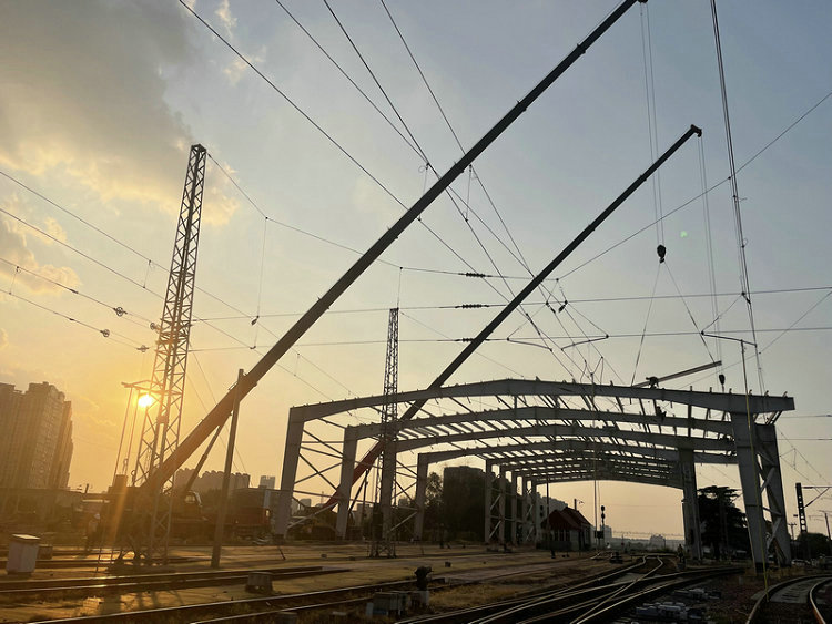 7月17日下午,隨著營業(yè)線III級施工命令下達,鄭州北站作業(yè)棚改造工程最后一次檁條吊裝施工開始,施工時長為120分鐘,主要進行門式鋼架作業(yè)棚屋面檁條吊裝作業(yè)。本次吊裝采用兩臺130噸吊車進行,兩臺吊車分別吊裝屋面檁條25根。