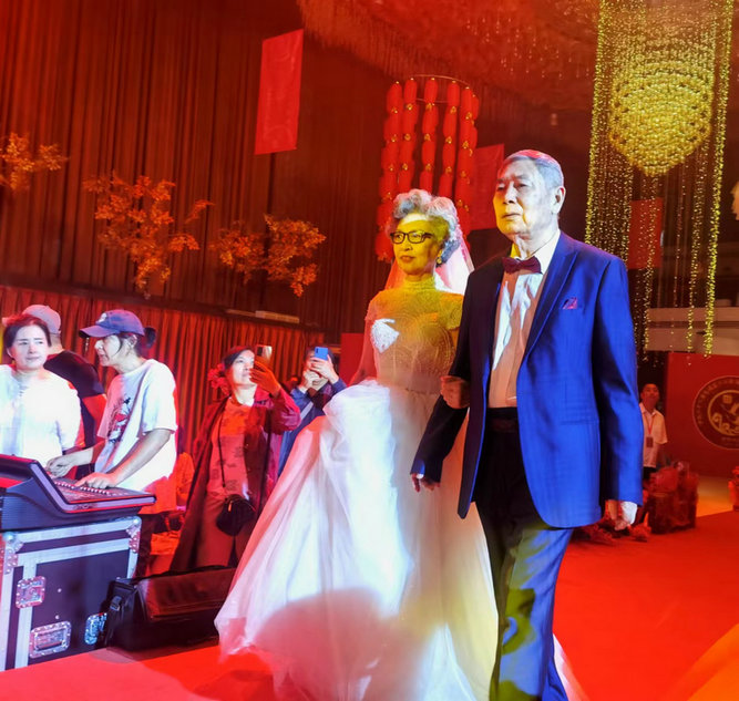 喜結(jié)百年緣,攜手一生情?;槎Y進(jìn)行時(shí),退休老職工杜然精神矍鑠地與相濡以沫50年的老伴牽手入場,緊隨其后結(jié)婚40、30、20、10周年的5對“老工程”夫妻代表依次入場,向新人贈(zèng)送五谷禮,并送上深深祝福。每一絲絲白發(fā)都連接著一個(gè)個(gè)項(xiàng)目,每一次次奉獻(xiàn)見證了一場場拼搏。接過老一輩鐵建人的接力棒,讓光彩的事業(yè)薪火傳承;不忘創(chuàng)業(yè)者的傾情奉獻(xiàn),續(xù)寫鐵建人的驕傲和榮光。公司領(lǐng)導(dǎo)的良苦用心感動(dòng)全場,雷鳴般的掌聲經(jīng)久不息。
