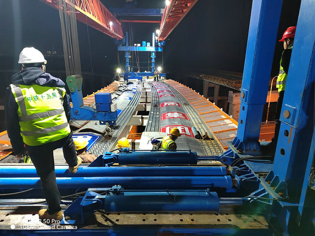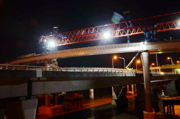 4月份,該項(xiàng)目部組織開展“90天六比六創(chuàng).鐵建杯”勞動(dòng)競(jìng)賽,將全員的智慧和力量凝聚到項(xiàng)目的安全質(zhì)量和進(jìn)度上來(lái)。隨著濱海互通卸梁站和提梁站的建成,由舟山曲線海運(yùn)鋼混疊合梁改為直達(dá)濱?;ネìF(xiàn)場(chǎng),架梁進(jìn)度大大加快。4月7日濱海互通拼寬橋第一片鋼混疊合梁架設(shè)成功、27日F匝道架梁順利上跨金堂大橋、5月28日和6月8日第4和第5座匝道架梁相繼完成。6月27日2號(hào)拼寬橋右幅與金塘大橋相接、6月25日A、D匝道架梁成功上跨金塘大橋,消除了濱?;ネㄗ畲蟮陌踩L(fēng)險(xiǎn)。