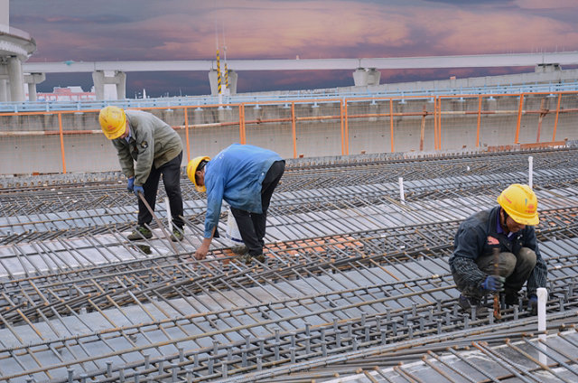 施工人員調(diào)整鋼筋網(wǎng)間距 呂奎元攝