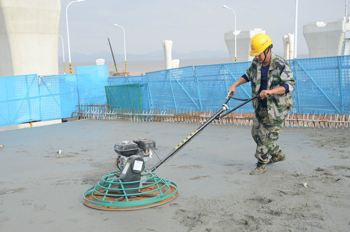 濱?;ネㄈL9705米,有8座匝道、4座拼寬,設(shè)有636座橋墩、470片梁,今年7月30日最后一片梁架設(shè)完成,施工陣地全面轉(zhuǎn)入橋面板和防撞欄施工。濱?;ネㄒ还灿?32跨長30米、寬10米、高0.4米的橋面板,其中149跨現(xiàn)澆橋面板、60跨疊合橋面板、23跨預(yù)制橋面板。為了滿足工期需要,2022年春節(jié)后便在已經(jīng)完成架梁的G匝道率先組織人力和設(shè)備進(jìn)行橋面施工。隨著架梁的一步步推進(jìn),陸續(xù)有匝道具備橋面施工條件,便在多條匝道先后進(jìn)行有序作業(yè)。在鋼梁上鋪設(shè)鋼筋、綁扎、焊接并進(jìn)行澆筑、震動(dòng)和抹面,這一套連續(xù)動(dòng)作都是由經(jīng)驗(yàn)豐富的施工人員在項(xiàng)目部管理人員的指導(dǎo)下進(jìn)行。白天奮戰(zhàn)10個(gè)小時(shí)左右,晚上挑燈繼續(xù)干,項(xiàng)目部班子成員和部門負(fù)責(zé)人、部員跟班作業(yè),嚴(yán)格監(jiān)管安全質(zhì)量。