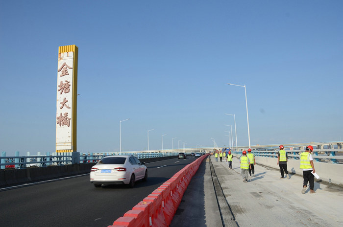 拼寬橋預(yù)制板與金塘大橋拼接完成后,進(jìn)行防撞護(hù)欄施工,最后一道工序是拆除金塘大橋護(hù)欄,擺放水馬進(jìn)行臨時(shí)安全防護(hù),對既有公路大橋銜接部分進(jìn)行切割,并與拼寬路面一并進(jìn)行“銑刨”,增加瀝青與混凝土層的粘合力,使路面形成一個(gè)整體受力面。