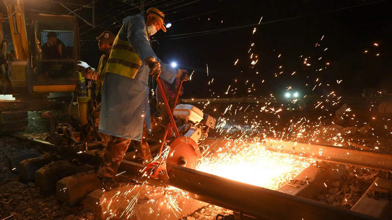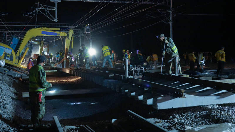 凌晨5時,精河站現(xiàn)場施工負責人對命令內(nèi)容、封鎖時間及安全防護部署工作確認無誤后,隨即下達施工命令。330多名參建人員聯(lián)合14臺挖機、4臺鏟車,迅速在各作業(yè)地點進入“戰(zhàn)斗”狀態(tài),切割鋼軌、拆卸扣件、拆除舊道岔、推運新軌排、插入新道岔……鋸軌點火花四濺、口哨聲、挖掘機轟鳴聲響徹整個施工現(xiàn)場,大干氛圍熱烈,口號振奮人心。