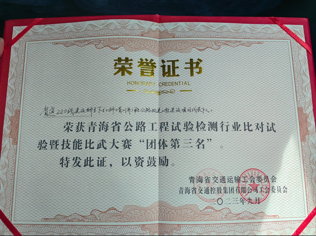 近日,北新路橋集團(tuán)西安分公司省道220線建下公路改建工程4標(biāo)項(xiàng)目試驗(yàn)員吳海龍,代表項(xiàng)目部參加青海省公路工程試驗(yàn)檢測行業(yè)比對試驗(yàn)暨技能比武大賽,并榮獲“團(tuán)體第三名”。