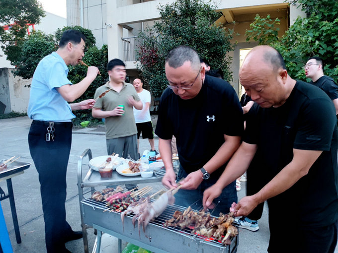 李秀鸞、劉翠景兩位廚師從上午忙到晚,為大家期盼的盛宴施展廚藝,經(jīng)過(guò)烹、炸、炒、燉、蒸等一番操作,擺上餐桌的紅燒鯉魚、清蒸螃蟹、清燉羊排、爆炒臘肉等美食色香味俱全,讓員工大飽口福。幾名年輕員工在院子里支起燒烤爐,加上木炭,然后將員工們愛(ài)吃的羊肉串、各種蔬菜串、年糕串和調(diào)料端來(lái),點(diǎn)燃木炭,大家踴躍動(dòng)手燒烤,抹油、撒調(diào)料,這一面烤一兩分鐘,翻個(gè)身烤另一面,一板接一板地烤,烤好的羊肉串、蔬菜串,除分發(fā)給未在一旁的員工品嘗外,其余傳遞到餐桌上。油煙在院子里四處彌漫,煙火氣十足,方圓幾百米便能嗅到濃濃的燒烤香味。