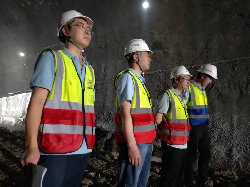 項目經理阮超(左一)書記何偉(右二)帶隊中梁山隧道“夜查”