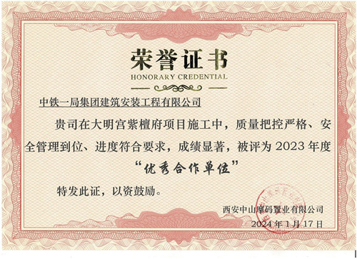 1月28日,中鐵一局建安公司金源檀府項(xiàng)目部收到業(yè)主單位西安中山摩碼置業(yè)有限公司發(fā)來表揚(yáng)信和榮譽(yù)證書,信中對(duì)項(xiàng)目部項(xiàng)目管理、工程進(jìn)度及安全質(zhì)量給予充分肯定。