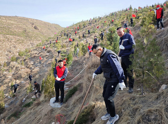 植樹地段擇為錦屏山,又名將軍山,指今富平縣城西北方向21.5公里處,海拔1347米。該山位于莊里鎮(zhèn)與曹村鎮(zhèn)交界處,因山巔修建有秦代大將王翦廟宇,屬喬山山脈,以昔時林木蒼翠,形如畫屏,高聳秀麗,儼若拱障而“錦屏列翠”得名?;顒又?,項目部黨政工團(tuán)與莊里鎮(zhèn)實驗區(qū)公檢法司、綜合執(zhí)法局、應(yīng)急管理局,城市規(guī)劃建設(shè)局等17個政府部門、企事業(yè)單位400余人參加,他們?nèi)逡唤M,手持工具,扛起鐵鍬帶上樹苗,搬樹、挖坑、扶苗、培土、澆水……銜接有序,大家熱情洋溢的勞動景象,合力栽下女貞、碧桃、側(cè)柏、垂柳等數(shù)十種樹木3000余棵。