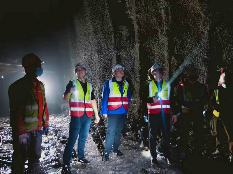 項目部書記韓崇生(右2)與經(jīng)理阮超(右1)在中梁山隧道進口帶班“夜查”